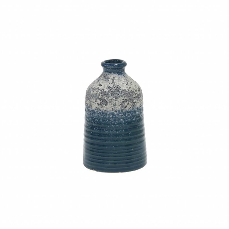 Blauwe handgemaakte vaas van HK living. Deze bloemvaas heeft een robuust gestreept reliëf.